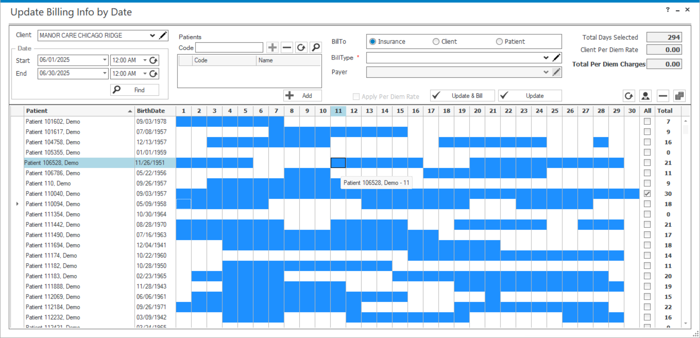 Use this form to update billing details (Bill To, Bill Type, Payer) for many orders at once based on service dates. The grid lists Patients (with DOB) and shows each day of the selected month as clickable cells.